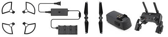 De standaard set bestaat uiteraard uit de volledig voorgemonteerde Spark met camera gimbal en is vliegklaar, een paar propellers, een accu en zijn lader op netvoeding, een micro-USB kabel en een doosje waar je hem in kan bewaren. De DJI Spark bestaat in 5 verschillende kleuruitvoeringen : wit, rood, geel, blauw en groen.