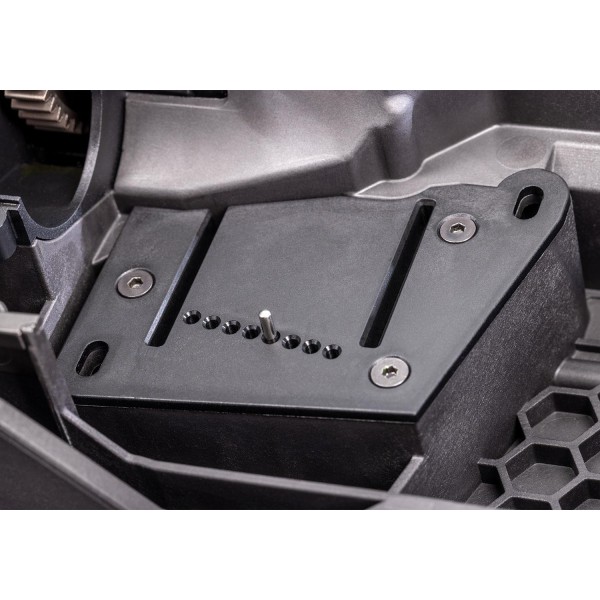 The motor and cradle join together to form a fixed gear mesh. A heavily reinforced mounting plate in the chassis keeps the motor and spur gear in perfect alignments
