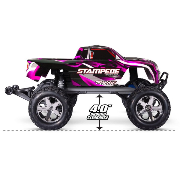 With 4 inches of center ground clearance, Stampede goes places other trucks can't! Stampede easisly tackles real world obstacles such as tall grass, curbs and rocks for non-stop fun no matter where you drive.