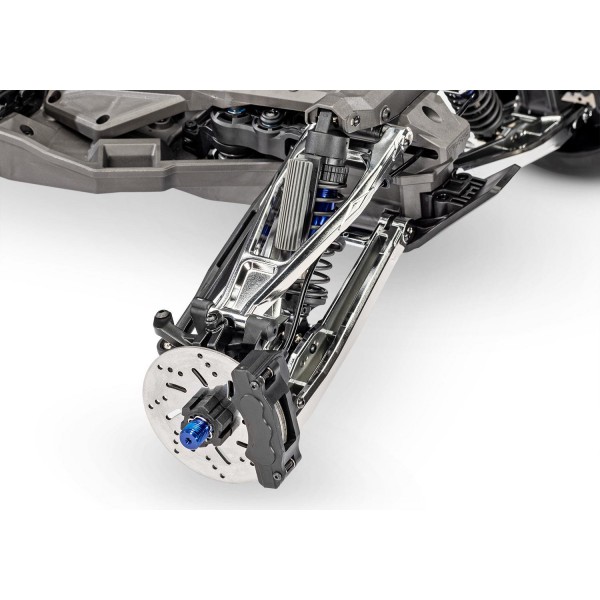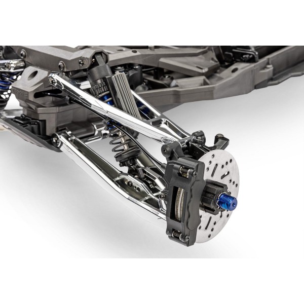 Powerful front disc brakes work in tandem with the rear motor braking for powerful and controlled 4-wheel stopping power. Sheathed cables clamp the calipers down on drilled stainless steel rotors for scale authenticity. A digital 2075 servo actuates the brakes through an adjustable linkage for greater braking precision and control.