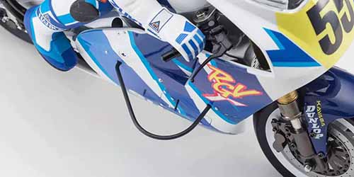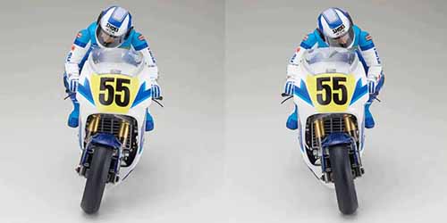 « Reproduction fidèle de la S.R.T. SUZUKI RGV-Γ, qui a fait une apparition exceptionnelle dans la catégorie 500 cm3 du Championnat du monde de course sur route 1992 et a également participé au Championnat japonais de course sur route (avec les numéros de course utilisés dans les deux championnats). Le niveau de détail rivalise avec celui d'un modèle d'exposition. »