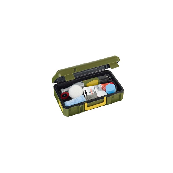 Safe storage in an attractive case made of high quality PP with basic equipment for immediate use: Rubber sanding disc with velcro, polishing sponge (medium), sheep wool polishing wheel, polishing felt disc for metals and non-ferrous metals (medium), 12 K 2000 grinding discs and a NIGRIN polishing emulsion (75 ml) and a micro fiber cloth.