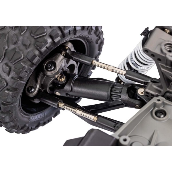 Rustler’s large 2.8” black chrome wheels provide terrain conquering ground clearance and commanding presence. Talon™ EXT tires have a square shouldered, aggressive tread design to dig into gravel, dirt and grass for incredible 4x4 traction and huge roost.