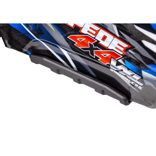 Reinforced bumpers protect the chassis against impacts. The specially designed front bumper provides a high approach angle that allow Stampede to climb up and over obstacles with ease. The rear bumper mounts a perfectly positioned wheelie bar to help prevent Stampede 4X4 VXL from back flipping under its explosive power.