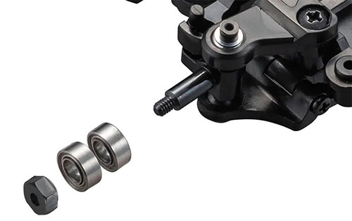 New front knuckles with integrated kingpins reduce scrub by 1.5mm on each side compared to the MR-03, realizing sharper and more linear control. The change to 3mm inner diameter ball bearings also reduces rotational resistance.