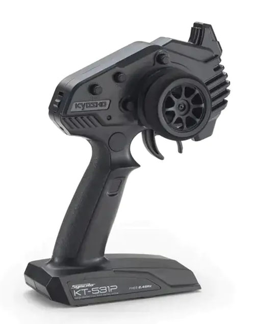 Includes Syncro KT-531P transmitter with a steering wheel that mimics the steering wheel of a real car and pistol-grip throttle (speed control). Adjust the neutral position of steering and throttle with trims, as well as steering angle with dual rate adjustment. It is also possible to operate in training mode with a reduced vehicle speed (training mode is the default setting).